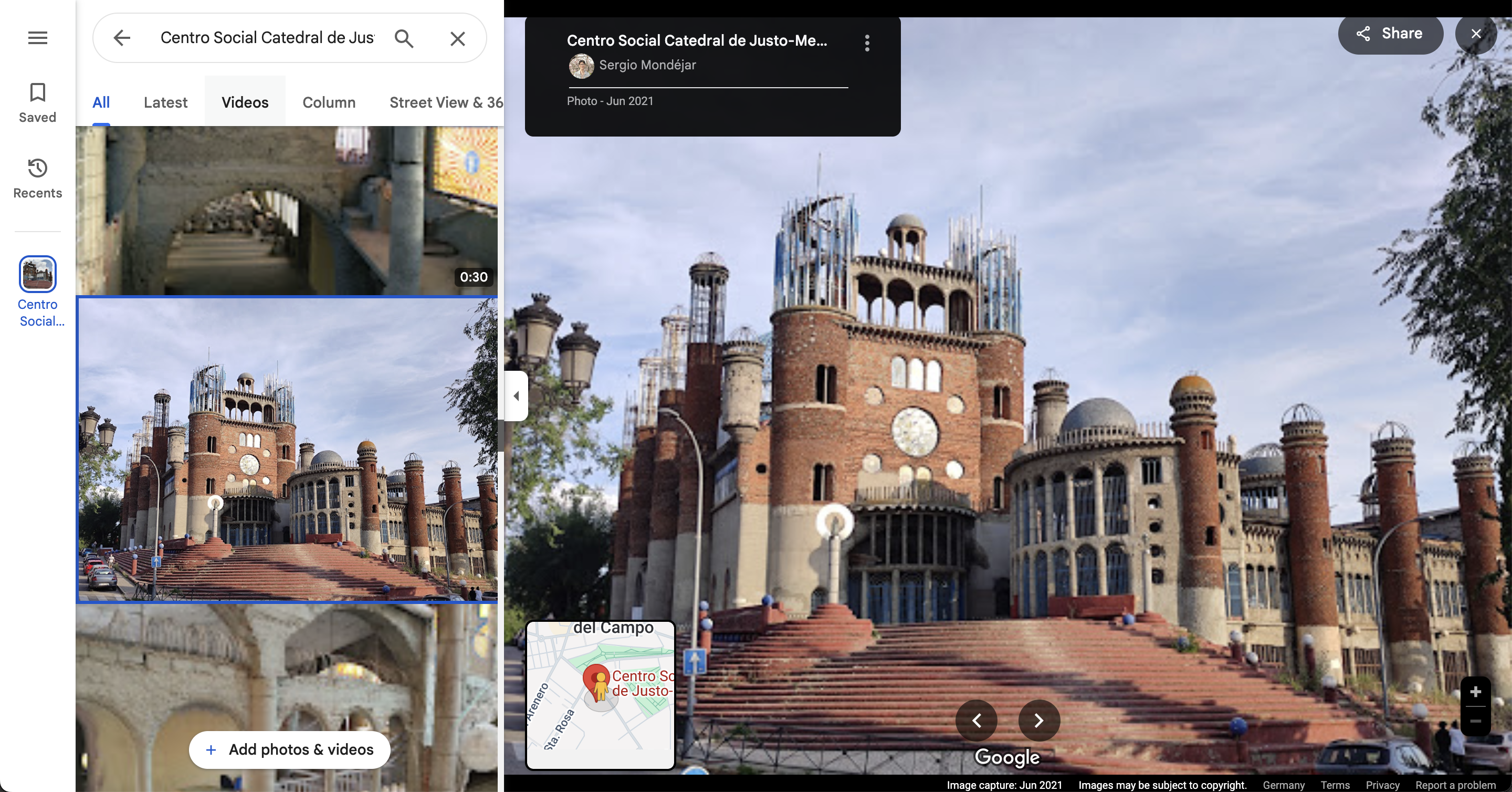 A Google maps page showing pictures of a church in Spain. Part of the curated list: ≡ Pitch dark Tags:Architecture google.com/maps/place/Centro+Social+Catedral+de+Justo-Mensajeros+de+la+Paz/@40.3942222,-3.488246,3a,75y/data=!3m8!1e2!3m6!1sAF1QipOdy_7mogcHXt3fwOysPVRTY2BeVb2X1kS8ndxi!2e10!3e12!6shttps:%2F%2Flh5.googleusercontent.com%2Fp%2FAF1QipOdy_7mogcHXt3fwOysPVRTY2BeVb2X1kS8ndxi%3Dw203-h152-k-no!7i4624!8i3472!4m7!3m6!1s0xd42399227f38859:0x46f173b599d618b7!8m2!3d40.3941077!4d-3.4884106!10e5!16s%2Fg%2F121hdvv_?entry=ttu&g_ep=EgoyMDI1MDEyNy4wIKXMDSoASAFQAw%3D%3D
