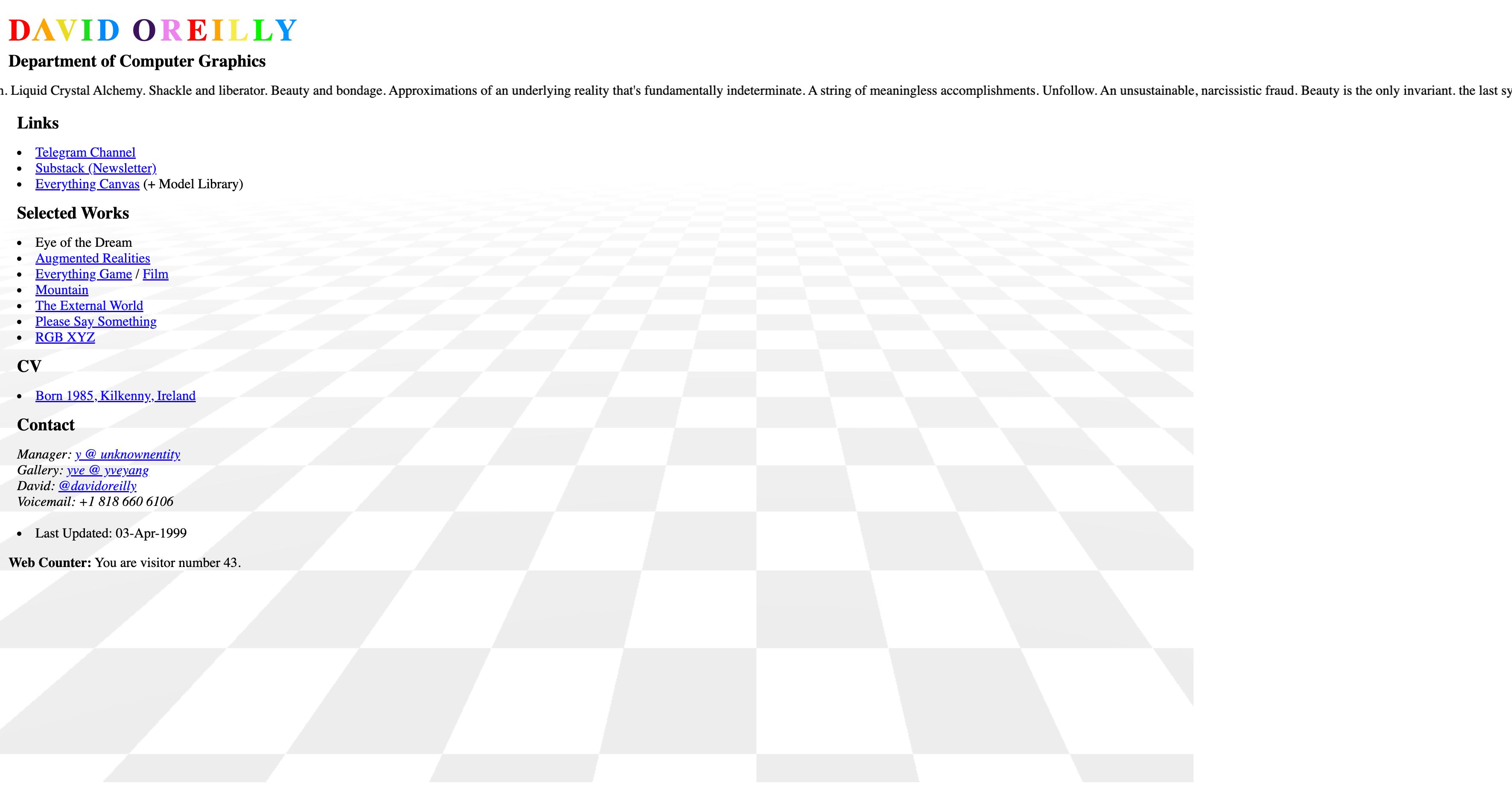 Personal artist website of David O Reilly Part of the curated list: ≡ Cunty Tags: WebsiteAsArtworksPersonalWebsitesTech davidoreilly.com
