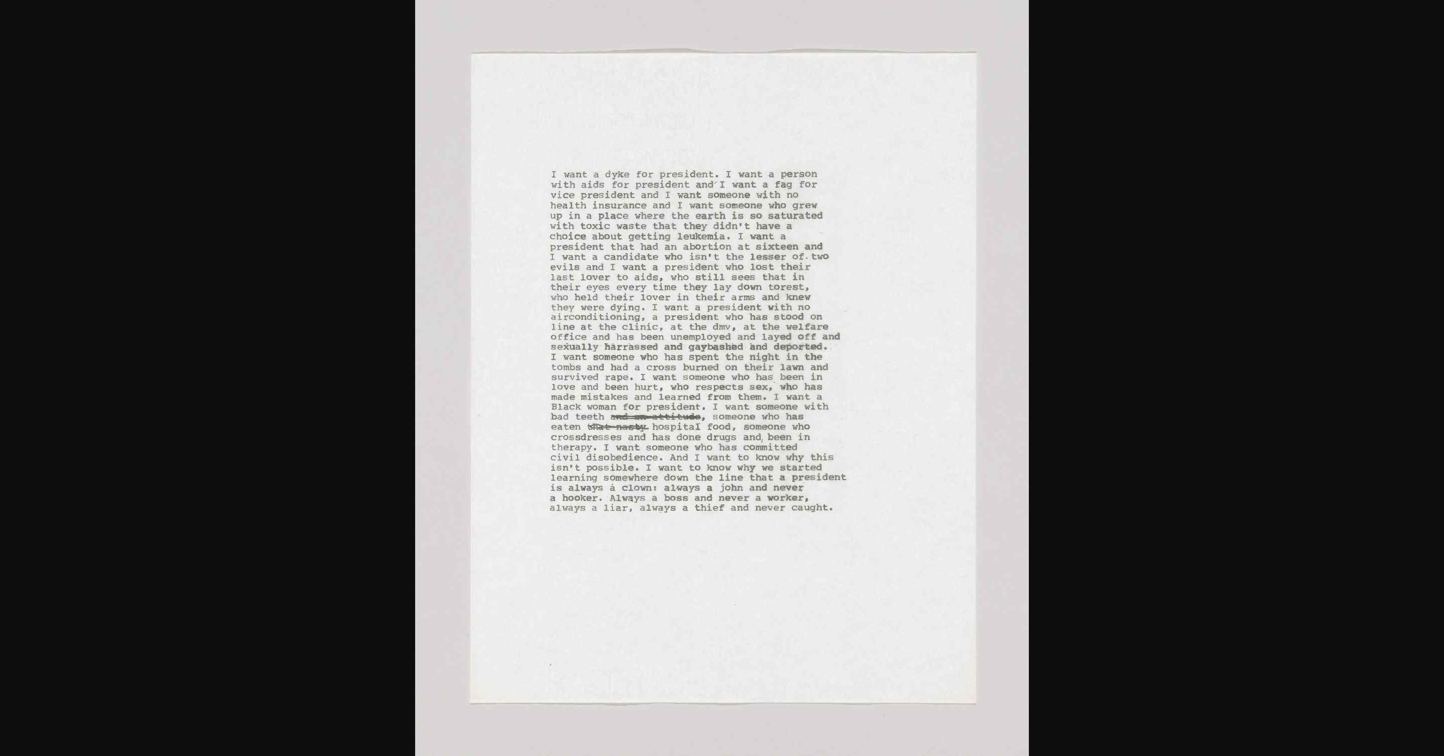 Image of a Poem by Zoe Leonard’s asking for a Dyke as president in the context of a US-election in the 90s.