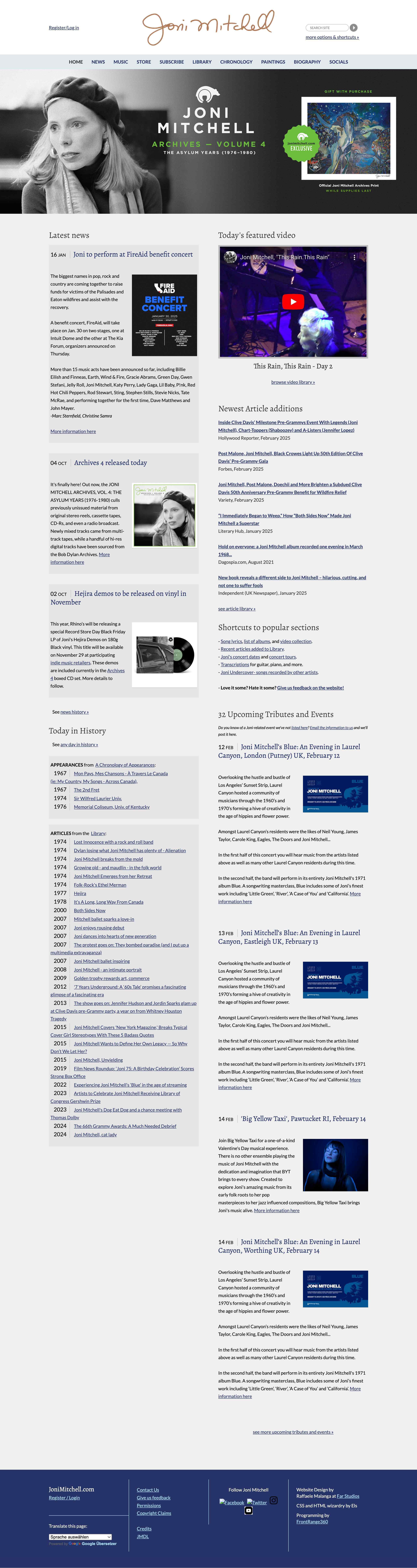 Website of musician Joni Mitchell. Submitted to ≡ Pavilion Visitor Entries by Henrique Tags:MusicPersonalWebsites jonimitchell.com