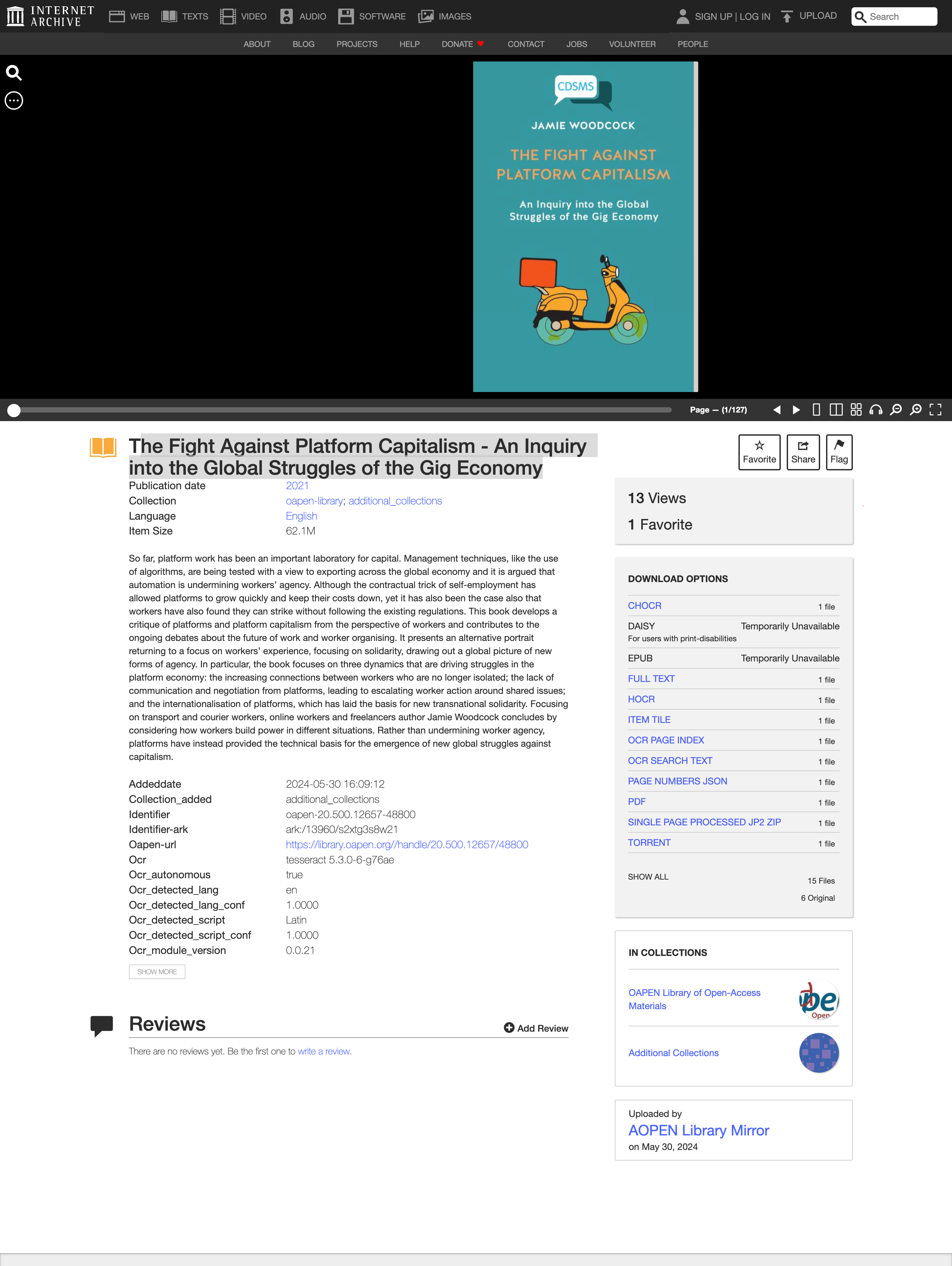 PDF of book ‘The Fight Against Platform Capitalism - An Inquiry into the Global Struggles of the Gig Economy’ on [archive.org].