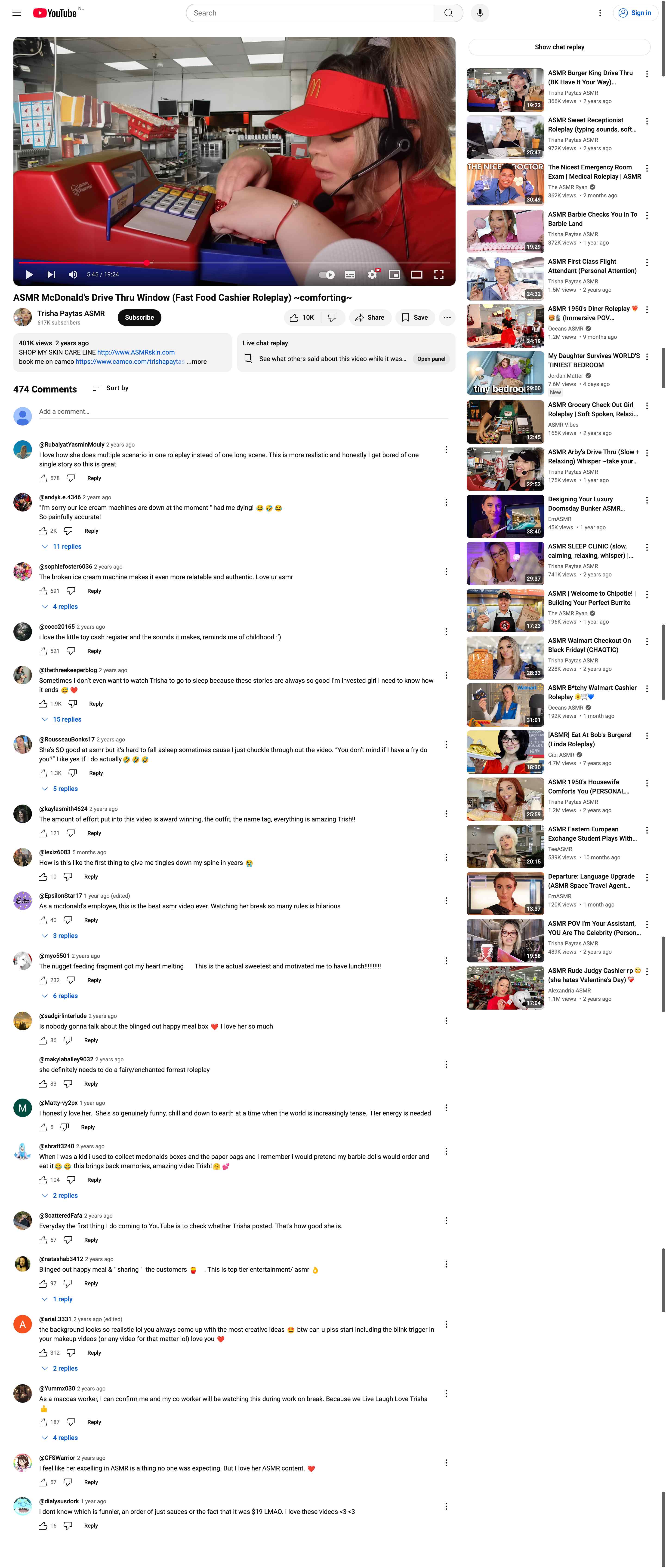 Video of Trisha Paytas on [YouTube] making ASMR in a McDonald’s drive through-setting.