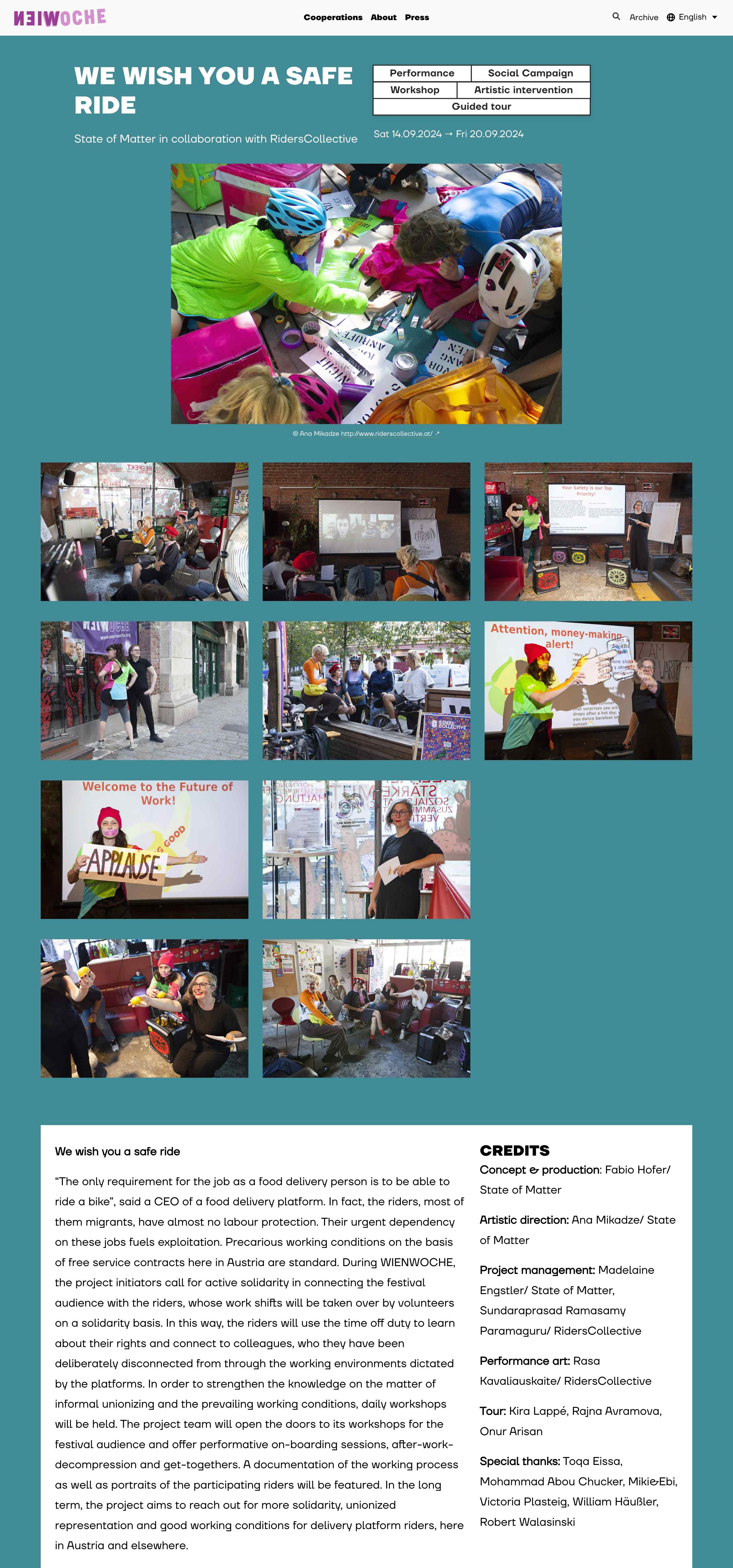 Project-page of intervention with and about the conditions of working as delivery riders at festival Wien Woche 2024.