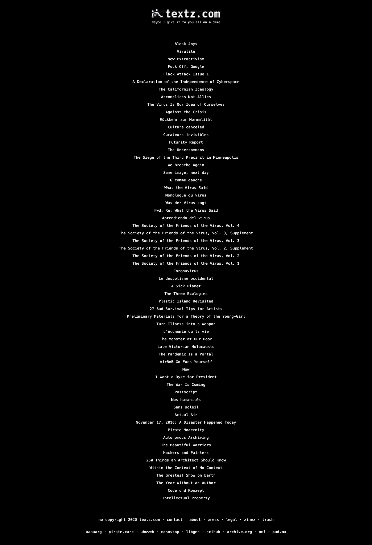 Curated site of texts around the politics of technology, the philosophy of no copyright, and beyond.